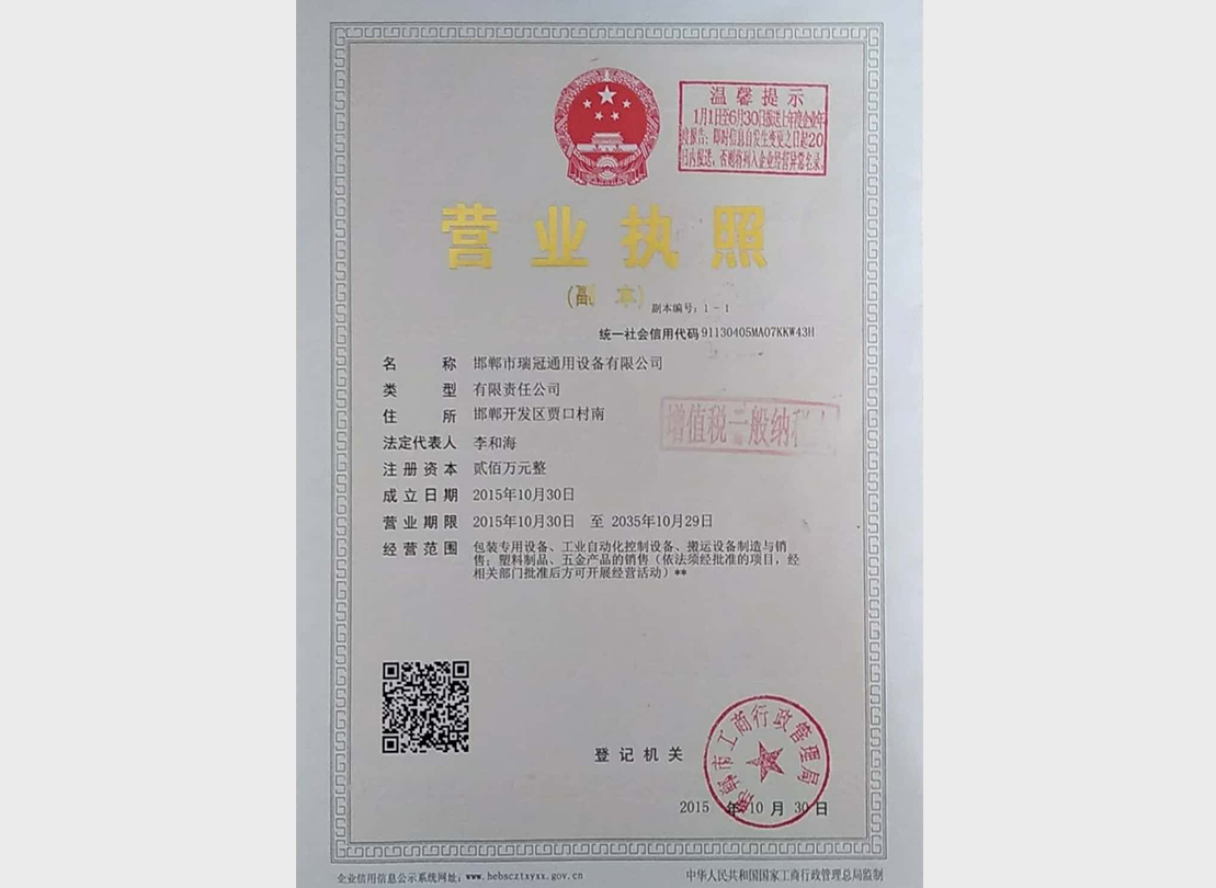邯鄲市瑞冠智能化裝備有限公司辦公室地址位于具有1萬年的歷史和3100年的建城史的邯鄲,邯鄲 邯鄲開發(fā)區(qū)賈口村南,于2015-10-30 在邯鄲工商局注冊成立,注冊資本為200萬人民幣(萬元),公司已經(jīng)公司發(fā)展壯大的5年,愿與社會各界同仁攜手合作,謀求共同發(fā)展,繼續(xù)為新老客戶提供優(yōu)秀的產(chǎn)品和服務(wù)。我公司主要經(jīng)營包裝專用設(shè)備、工業(yè)自動化控制設(shè)備、搬運設(shè)備制造與銷售;塑料制品、五金產(chǎn)品的銷售(依法須經(jīng)批準(zhǔn)的項目,經(jīng)相關(guān)部門批準(zhǔn)后方可開展經(jīng)營活動),我公司與多家邯鄲零售商和代理商建立了長期穩(wěn)定的合作關(guān)系,品種齊全、價格合理,企業(yè)實力雄厚,重信用、守合同、保證產(chǎn)品質(zhì)量,以多品種經(jīng)營特色和薄利多銷的原則,…